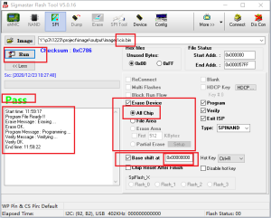 2. 按如下红框的步骤,选择需要烧录cis.bin以及对应的flash地址(如下),然后点击run即可,烧录完成后工具显示pass表示已烧录成功。