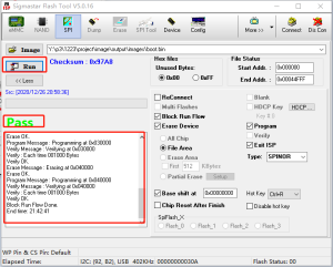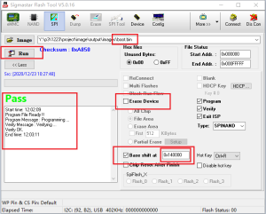 2. 按如下红框的步骤,选择需要烧录boot.bin以及对应的flash地址(如下),然后点击run即可,烧录完成后工具显示pass表示已烧录成功。